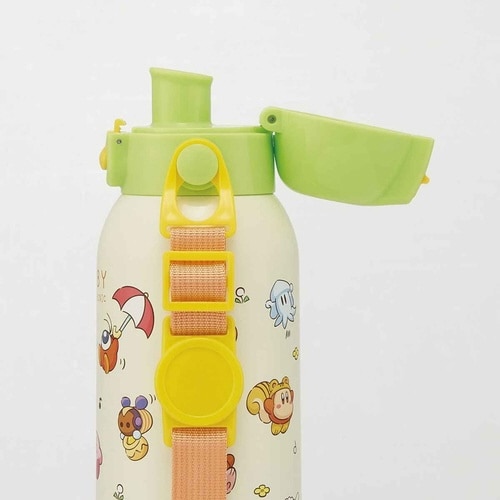 水筒の蓋はボタンを押すだけで開けることができるワンタッチ式です。 持ち運びに安心のボタンロック機能付きです。 飲む時に蓋が落ちてこない仕様です。 長さ調節可能なショルダーベルトが付いています。