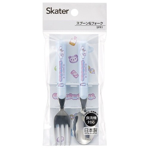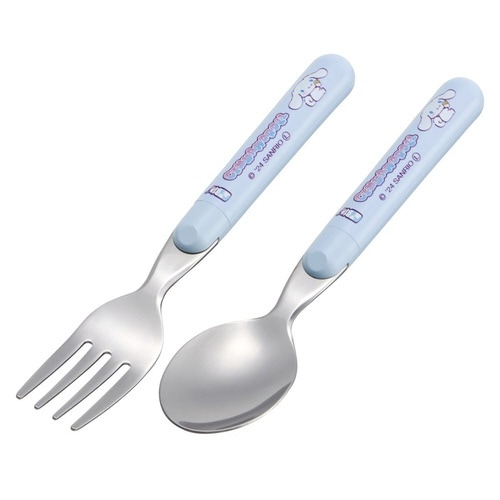 シナモロールのお子様用スプーンとフォークのセットです。 大好きなキャラクターと一緒ならお食事も楽しくなります。 持ち手は丸く、先端はステンレス製で使いやすいです |