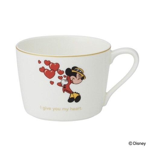 ミッキーとミニーが描かれたマグカップです。 表裏で異なるデザインを楽しめます。 温かみのある乳白色と滑らかな質感、美しい透光性が特徴の高級磁器「ボーンチャイナ」を使用しています |