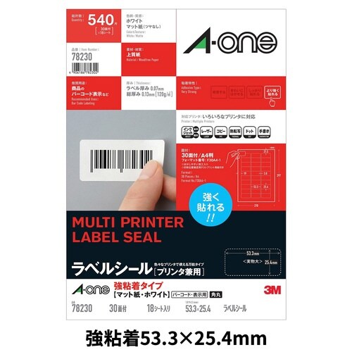 ラベルシール [プリンタ兼用] 強粘着タイプ マット紙 ホワイト A4 30面 四辺余白付 ラベルサイズ53.3×25.4mm18シート/パック 78230