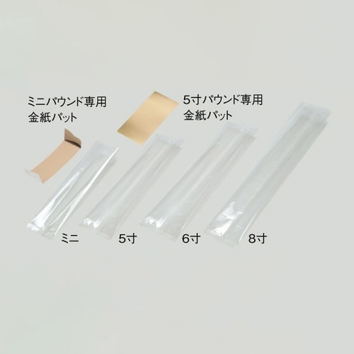 パウンド用ケースミニに適合するガス袋。脱酸素剤対応。ノッチ入。専用金紙パット付。パットサイズ:110×53mm 商品材質:バリアNY#15/LLDPE#50+紙 |