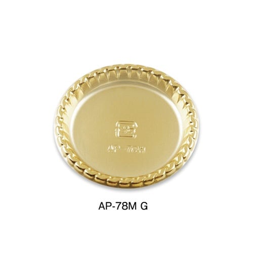 ゴールドの菓子トレーです。商品サイズ:78φ×高9(底60φ)mm 商品材質:A‐PET |
