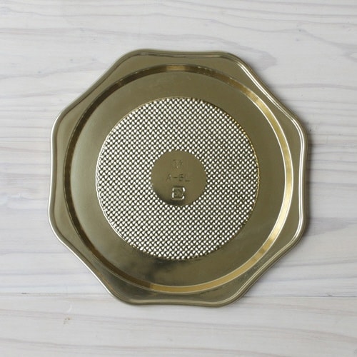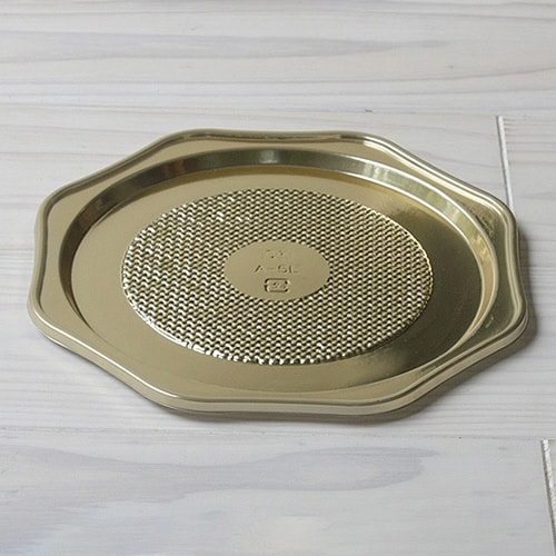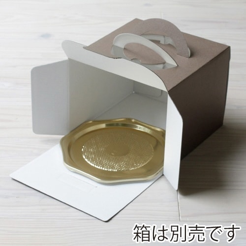 直径約15cmのホールケーキ5号用のゴールドプラスチックトレーです。八角形の形状でケーキがさらに引き立ち、プチゴージャスを演出するときにオススメです。