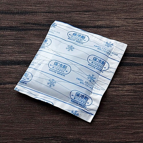 テイクアウトの商品に使用できる、汎用サイズの保冷剤です。持ち帰り用のケーキ箱に自然に収まるサイズになっています。誤飲防止のための注意書も記載されています。 |