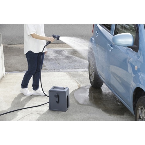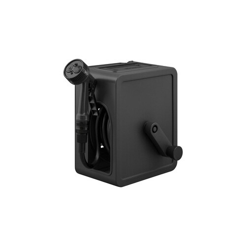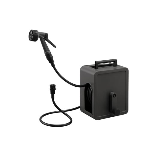 サイドホースやアクアガンを収納できる、コンパクトなフルカバーホースリールです。アクアガンと蛇口口金を付け替えて、手持ちと据え置き両方に対応できます。蛇口との接続が簡単なワンタッチコネクター付きです。 |