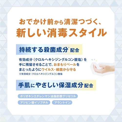 持続する殺菌成分※で、おでかけ前から清潔つづく。 手肌にやさしい、3種類の保湿成分をバランスよく配合しています。※有効成分:クロルヘキシジングルコン酸塩 |