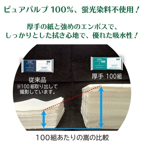 しっかり吸収、しっかり拭ける厚手タイプ。ピュアパルプ100%。、蛍光染料不使用で優れた吸水性。 |