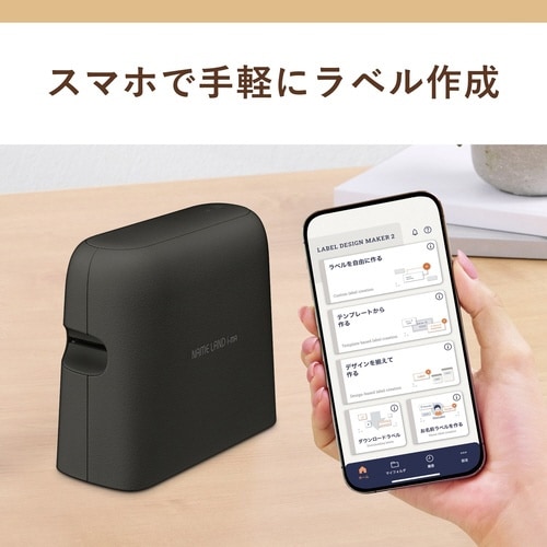 キーボードを無くし、スマホやPCでデザインするラベルライター。ハーフカット機能付きオートカッター搭載、24mm幅テープまで対応。ブラックモデル。 |