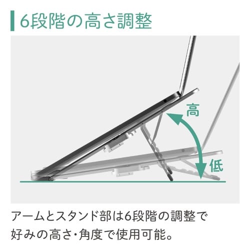 ノートパソコンやタブレットを置ける折畳式のノートパソコンスタンドです。折りたたむと超コンパクトな手のひらサイズで、質量も約190gと軽量なので持ち運びが簡単。角度調整は6段階で調整できます。 |