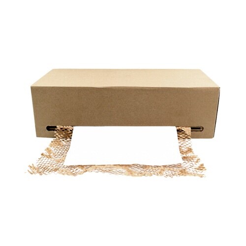 再生材を使用した伸縮性に優れたハニカム緩衝紙。自由に使用量を決められるロールの段ボール箱入りタイプ。(アンダー紙入り)リサイクルも可能。小物、精密機器部品、食品、アクセサリーなどの包装に最適。 |