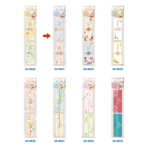 お土産などのちょっとしたギフトを渡すときに使える、付箋タイプののし紙です。のしノートよりも気軽なシーンで使えるサイズ感とデザインが特徴です。