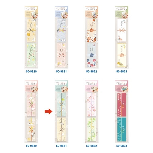 お土産などのちょっとしたギフトを渡すときに使える、付箋タイプののし紙です。のしノートよりも気軽なシーンで使えるサイズ感とデザインが特徴です。