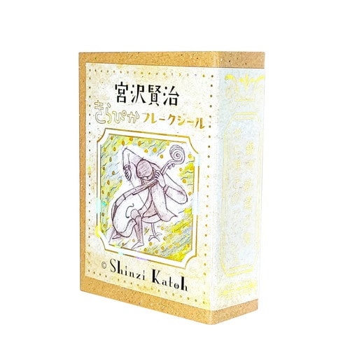 Shinzi Katohが宮沢賢治の作品世界を幻想的に描く「宮沢賢治幻燈館」シリーズ。初めてのフレークシールはマスキングテープ素材を使用し、ゴールドホログラム箔をあしらった切手型のデザインです。 |
