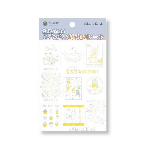 こだわりの配色で宮沢賢治の作品世界を表現したシールです。レトロな雰囲気が魅力の活版印刷で仕上げました。様々な作品の世界観がギュッと詰まったデザインです。