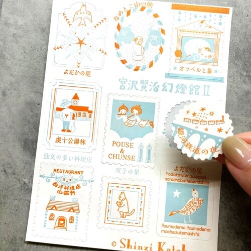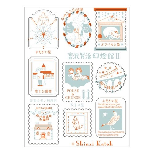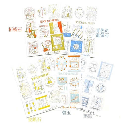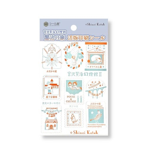 こだわりの配色で宮沢賢治の作品世界を表現したシールです。レトロな雰囲気が魅力の活版印刷で仕上げました。様々な作品の世界観がギュッと詰まったデザインです。 |