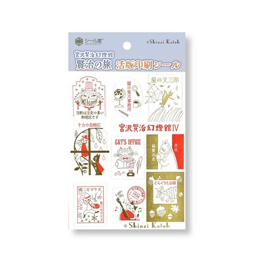 こだわりの配色で宮沢賢治の作品世界を表現したシールです。レトロな雰囲気が魅力の活版印刷で仕上げました。様々な作品の世界観がギュッと詰まったデザインです。