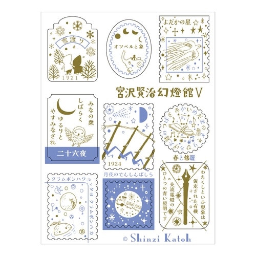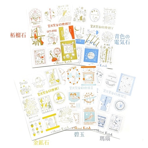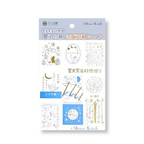 こだわりの配色で宮沢賢治の作品世界を表現したシールです。レトロな雰囲気が魅力の活版印刷で仕上げました。様々な作品の世界観がギュッと詰まったデザインです。