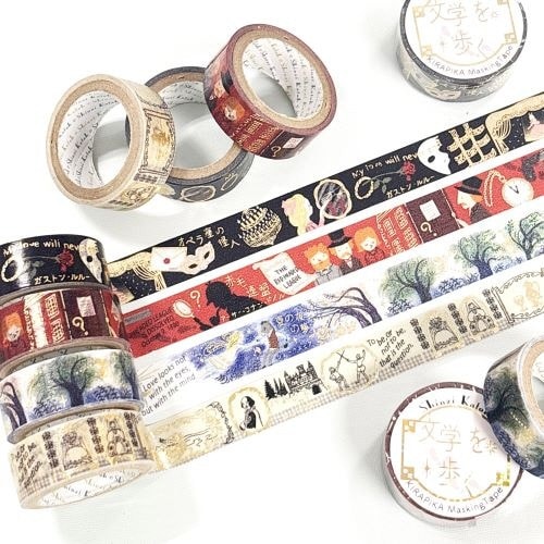 Shinzi Katohが名作文学の世界を色彩豊かに描いた「文学を歩く」シリーズのきらぴかマスキングテープ第四弾。日本文学から海外の名作、戯曲まで幅広い作品をモチーフになっています。 |