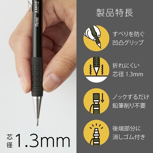 軸色:ブラック | 芯径:1.3 | 材質:先金:真鍮、軸・ノック:再生ABS、グリップ:エラストマー、クリップ:ステンレス | 機構:ノック式 | …