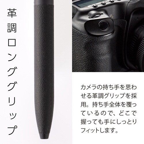 静かなノック感・革調のロンググリップ・マットな質感を備えた、なめらか油性ボールペンです。