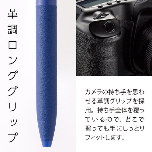静かなノック感・革調のロンググリップ・マットな質感を備えた、なめらか油性ボールペンです。 |