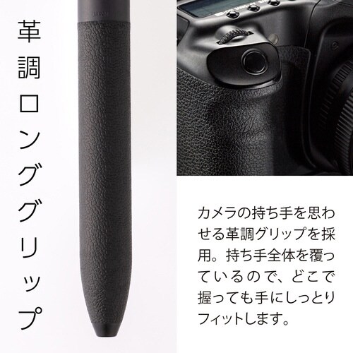 静かなノック感・革調のロンググリップ・マットな質感を備えた、なめらか油性ボールペンです。 |
