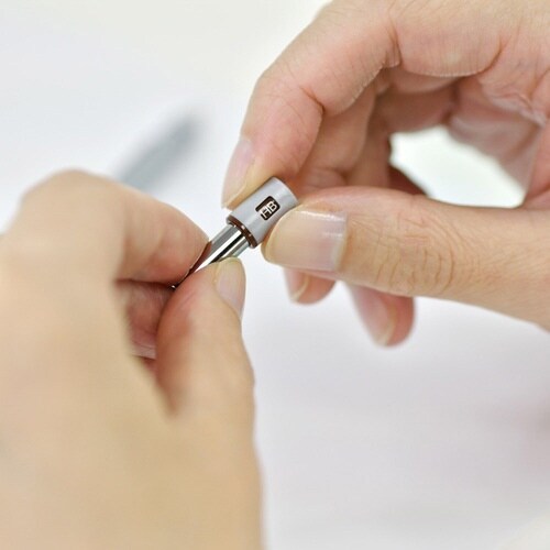 筆記時に線や文字を確認できる細身のペン先。