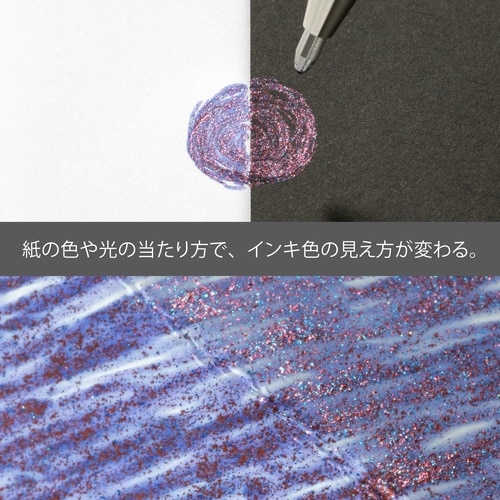 主役級のかがやき。見る角度によって色味が変わり、さらに黒い髪と白い紙で異なる色に見える、グリッター顔料入りのインキを搭載。一目で虜になるようなかがやきを存分にお楽しみいただけます |