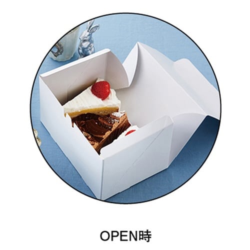 大きく開いてケーキの出し入れがスムーズな洋菓子箱です。商品サイズ:120×180×H105mm 商品材質:紙 |