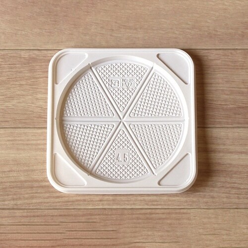 直径約13.5cmのホールケーキ4.5号用のホワイトプラスチックトレーです。最大直径14cmまでのホールケーキにご利用頂けます。カットの目盛もついていて便利です。