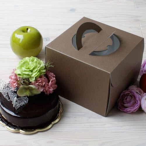 ホールケーキの5号箱です。高さがあるのでデコレーションケーキやシフォンケーキなどにオススメです。深みのあるビターカラーは落ち着いた雰囲気のカフェやケーキ店にぴったりです。トレーは別売です。