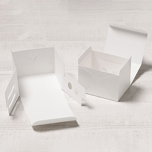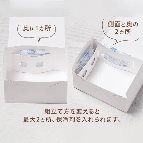 カットケーキ箱。カットケーキ1から2個用のサイズで、ちょっとしたお持ち帰り用にピッタリ。組み立て式形状で保冷剤スペースを「1ヵ所仕様」と「2ヵ所仕様」に変更可能です。 |