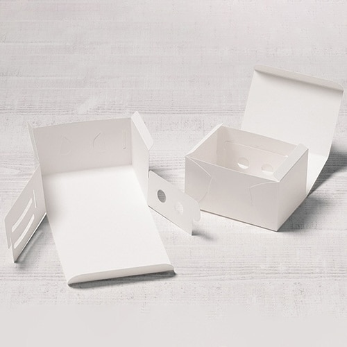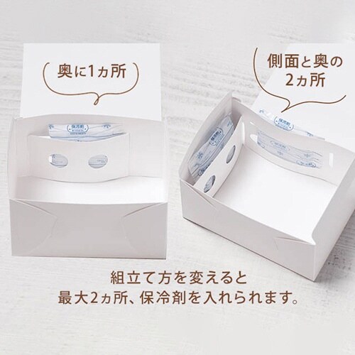 カットケーキ箱です。カットケーキ1から2個用のサイズで、お持ち帰り用にピッタリ。焼き菓子の詰め合わせ用にもお使いいただけます。組み立て式形状で保冷剤スペースを「1ヵ所仕様」と「2ヵ所仕様」に変更可能。 |