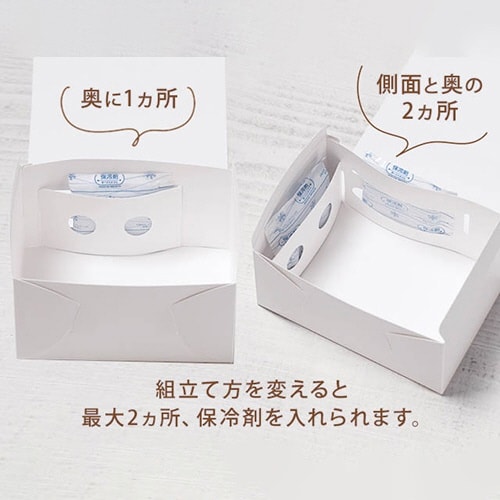 カットケーキ箱です。カットケーキ1から2個用のサイズで、お持ち帰り用にピッタリ。焼き菓子の詰め合わせ用にもお使いいただけます。組み立て式形状で保冷剤スペースを「1ヵ所仕様」と「2ヵ所仕様」に変更可能。