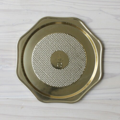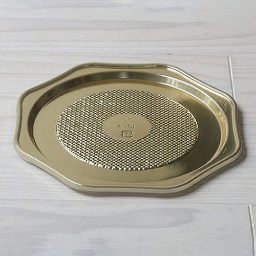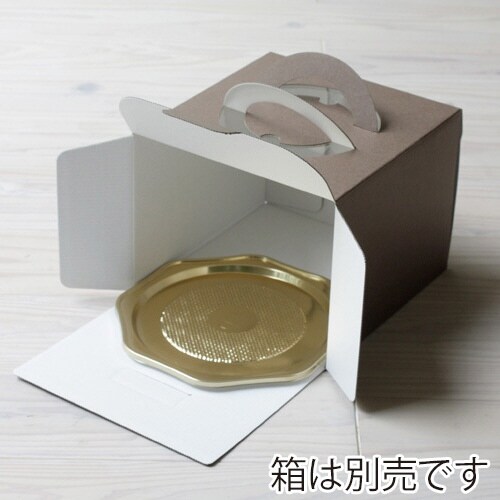 直径約15cmのホールケーキ5号用のゴールドプラスチックトレーです。八角形の形状でケーキがさらに引き立ち、プチゴージャスを演出するときにオススメです。 |