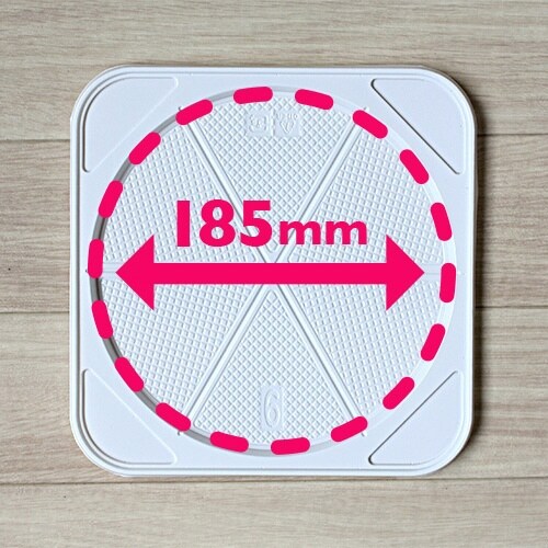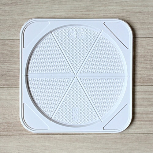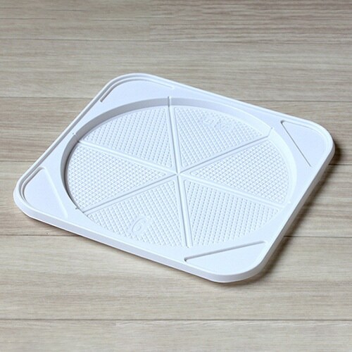 直径約18cmのホールケーキ6号用のプラスチックトレーです。カットの目盛もついていて便利です。
