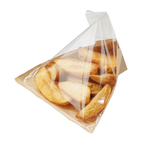 袋を立体的に組み立てる新感覚な包材。食べるときはフィルムを開きそのままお皿の代わりとして使用することができるため、面倒な洗い物を減らすことができます。またゴミとしてもかさばることなく捨てることが可能。