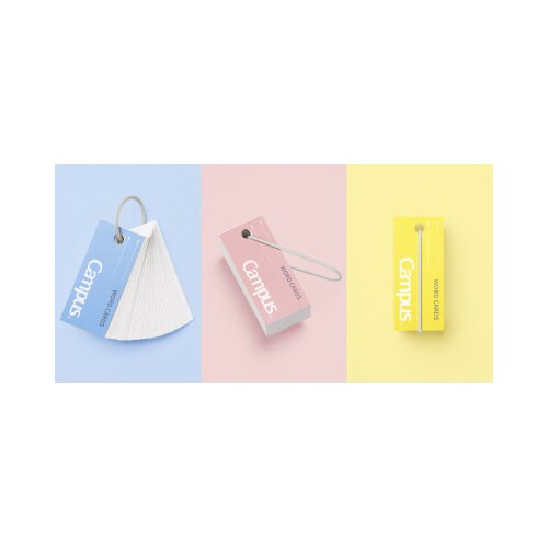 バンドでくるっとまとまるキャンパスの単語カード。カバンの中で広がりにくい。 |
