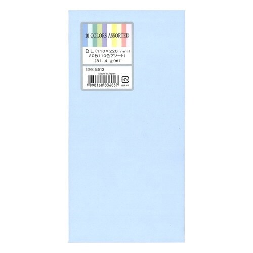 10色の封筒が2枚ずつ入っているテンカラー封筒です。一重封筒、DLサイズ(110x220mm)です。 |