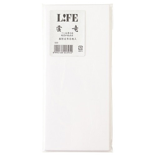 越前で生産された雲竜紙を使用した封筒です。ペン毛筆両用。細長い繊維が漉き込まれており、上品な印象をうけます。 |