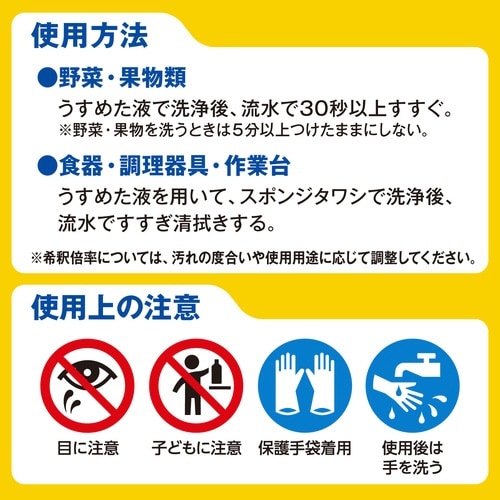| 注意事項 | ※詰め替え時に必要なカップ&ノズル(商品番号4277−7458)は別売りです。用途以外には使用しない。小児の手の届かないところに保管する。野菜・果物を洗う時は、5分以上つけたままにしない。流水の場合、食器および調理用具は5秒以上、野菜・果物は30秒以上、ため水の場合は水を替えて2回以上すすぐ。荒れ性の方や長時間使用する時、また原液をスポンジに含ませて使用する時は、炊事用手袋を使用する。使用後は手をよく水で洗い、クリーム等で肌の手入れをする。うすめた液を長時間保存すると変質することがあるので、使用のつどうすめる。詰め替える際には容器をよく水で洗い、乾かしてから詰め替える。 |