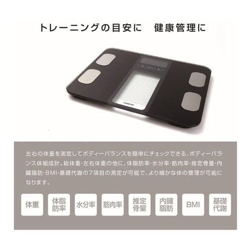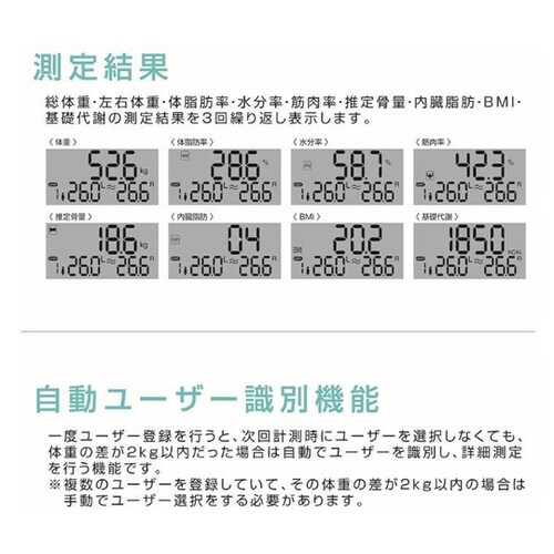 体の左右それぞれの体重を測定測定項目・体重・体脂肪率・水分率・筋肉率・推定骨量・内蔵脂肪・BMI・基礎代謝の7項目の測定が可能。 |