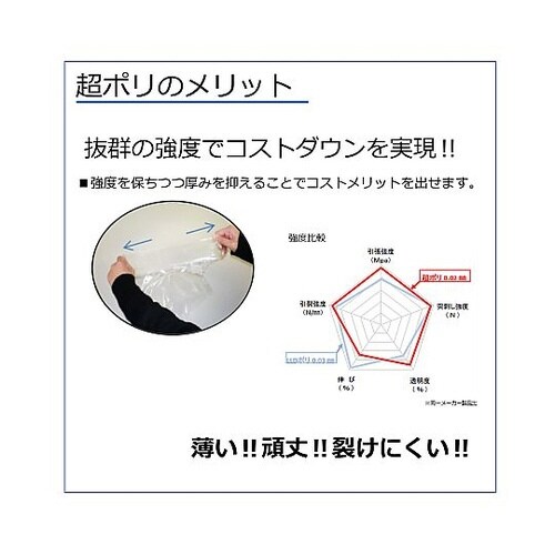 厚みをおさえながら、強度・透明度に優れた”超ポリ袋”。厚口タイプのポリ袋(0.06mm厚)と同等以上の強度があり、引っ張りや衝撃にも強く、破れにくい仕様です。 |