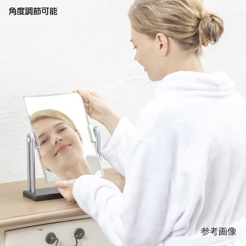メイクに便利な卓上ミラー。幅広面取りをした豪華な5ミリ厚ミラーを使用したスタンドミラー。台座はインテリアにマッチするMDF木材を使用、支柱はシルバー塗装を施しスタイリッシュ。