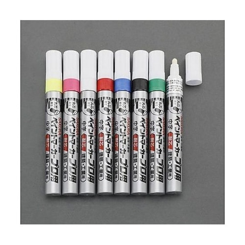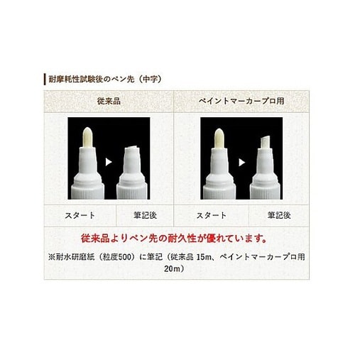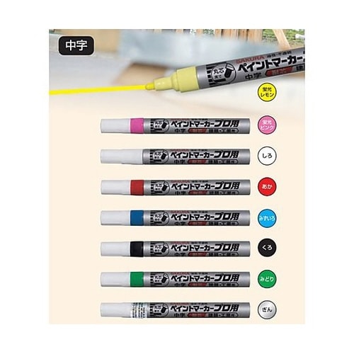 中字油性木材、金属、ガラス、プラスチック、ゴム、石材、段ボール、布など建築資材、工業資材へのマークチェック用ペン先がつぶれにくい、濃く鮮やかな発色ペン先が摩耗しにくいので、長く使うことができます。 |
