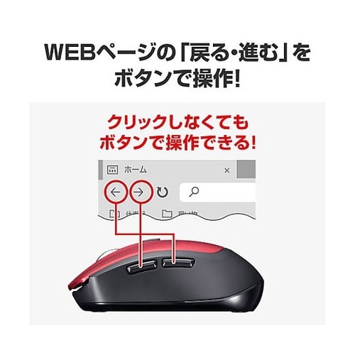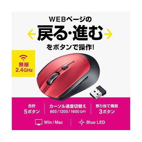 注意/付属電池はテスト電池ですので新しい電池をご購入ください。インターネット閲覧に便利な「進む」「戻る」ボタンが付いた、5ボタンワイヤレスマウスです。標準的なサイズで持ちやすく疲れにくい形状です。 |