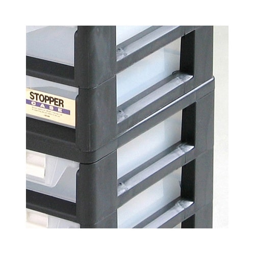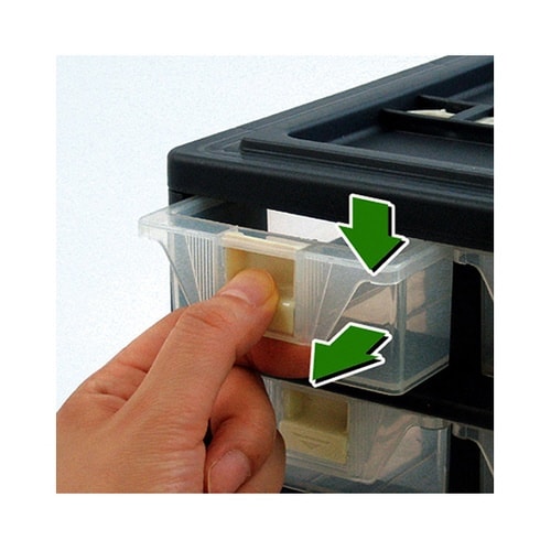 引き出しのストッパーで、中身の飛び出しを防ぎます。持ち運びができ、ケース同士のスタッキングも可能です。引き出しを閉めると自動的にロックがかかり、中身の飛び出しを防ぎます。 |