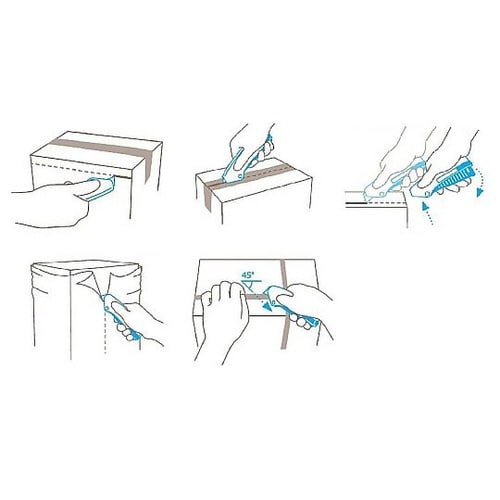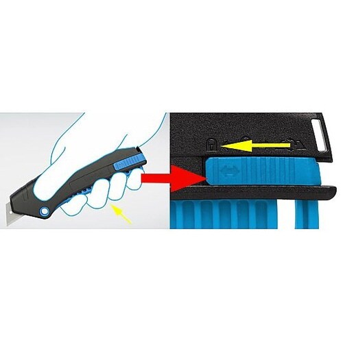 ロックボタンをスライドさせると握っても刃が出ない安全設計左・右利き兼用未使用時、刃は本体内に収納されています。レバーを押し込んでいる間のみ刃が出ています。レバーから指を離すと収納されます。 |