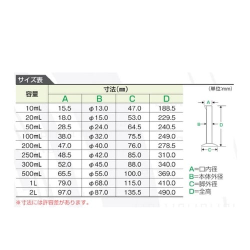 透明度が高く、シルクスクリーン印刷の目盛は鮮明で見やすいデザインです。研究・実験用から学校教材用と広範囲な用途に使用できます。 |