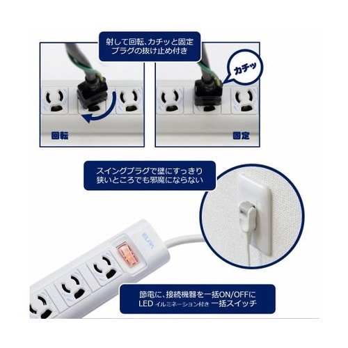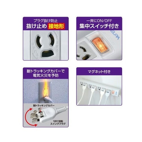 パイロットランプ付で通電状態が一目でわかり、消し忘れが防止できます。プラグ抜け止めで不意のプラグ抜けが無く、コンピュータなどのデータをしっかりガードします。 |